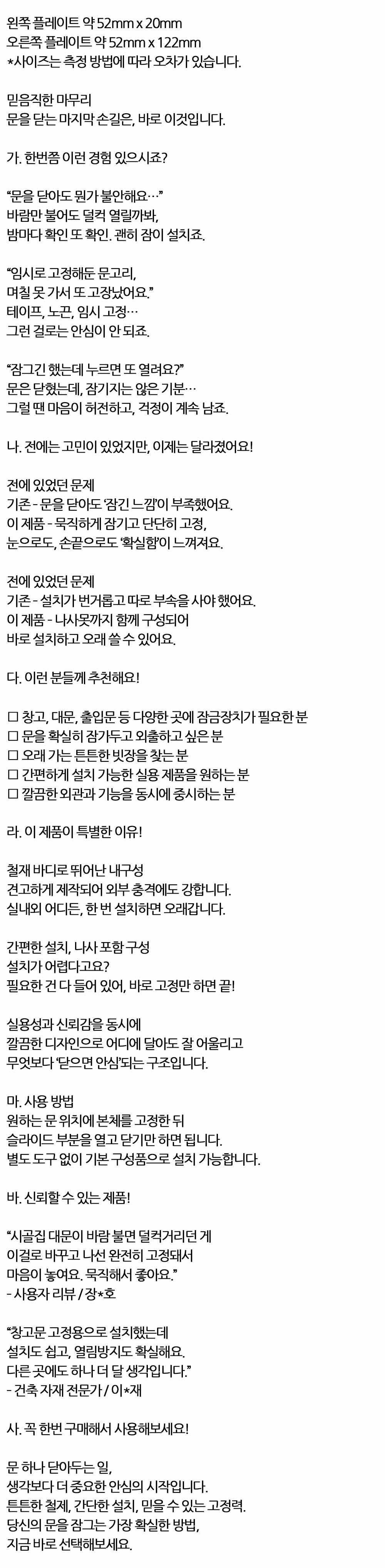 묵직하게 잠기고 단단히 고정 각종문 잠금빗장 75mm