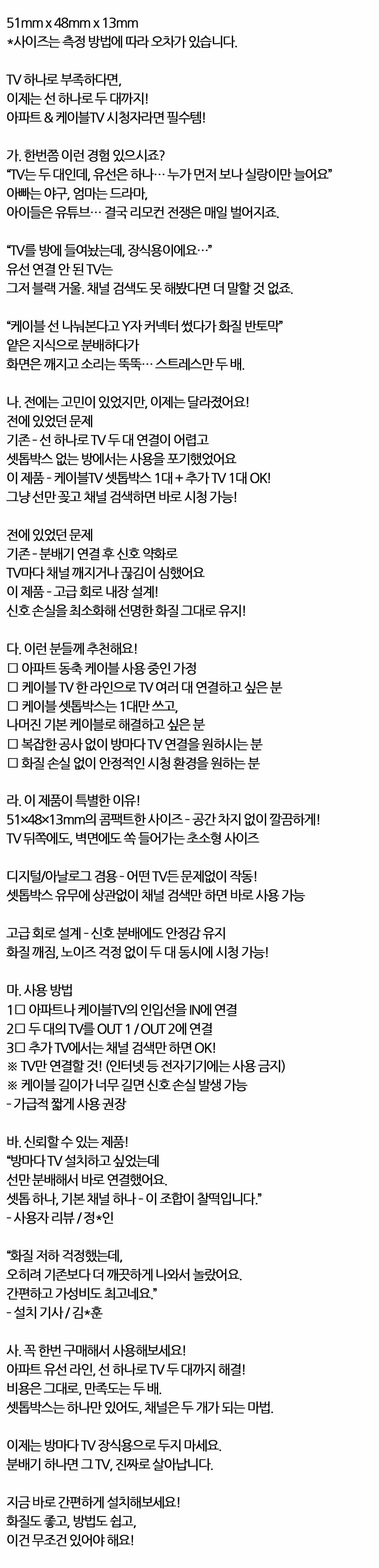 아파트 유선라인 하나로 두대까지 연결케이블 2분배기