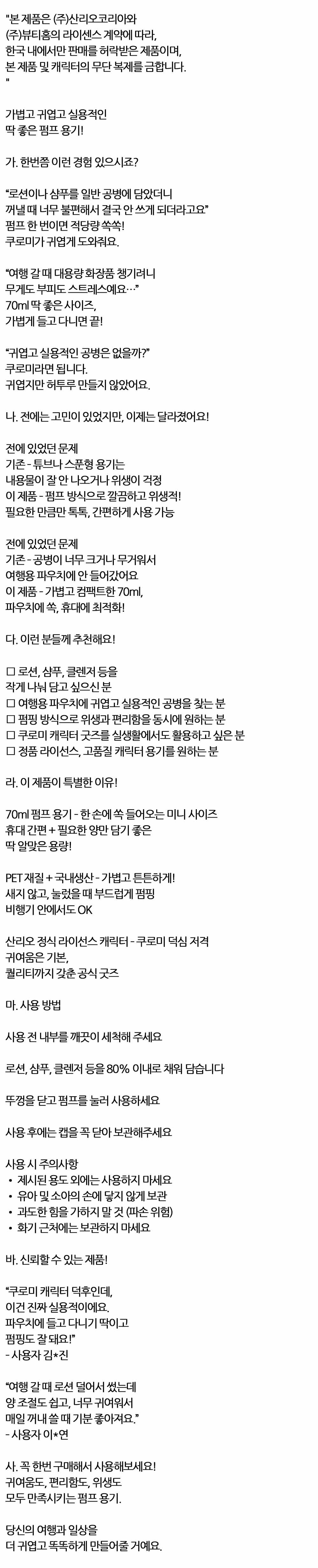 가볍고 귀엽고 실용적인 쿠로미 휴대용 펌프용기 70ml