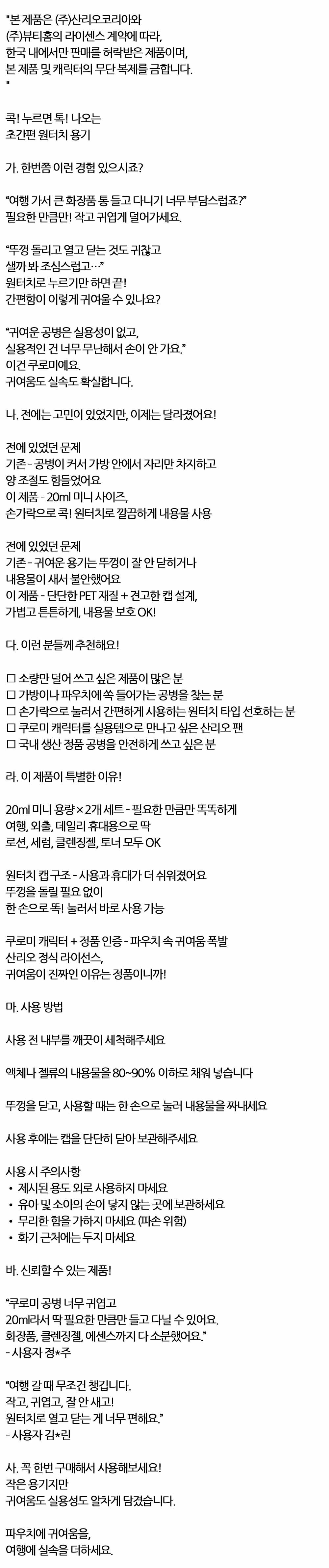 눌러서 바로 나오는 쿠로미 원터치 여행용기 20ml 2입
