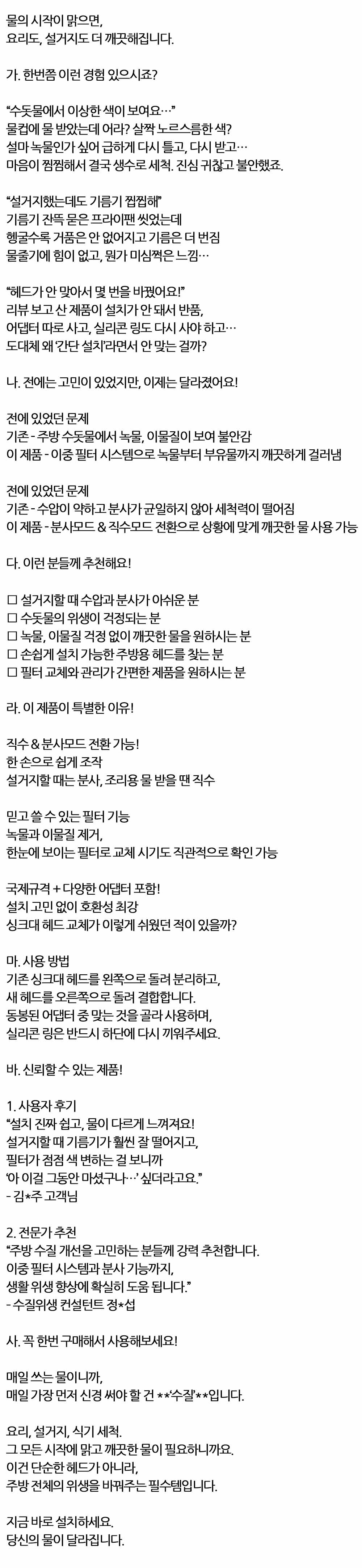 요리도 설거지도 더 깨끗해집니다 주방용 수전헤드
