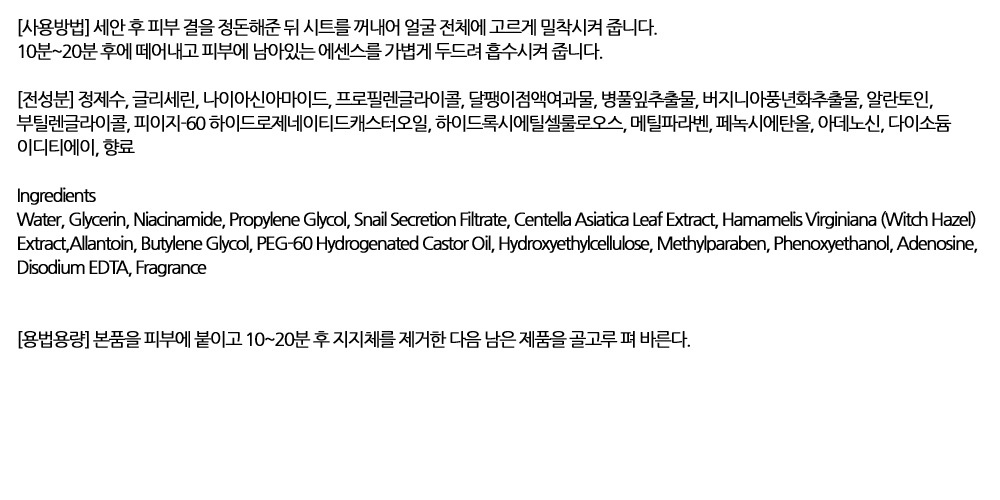 속건조를 잡고 피부결 촉촉하게 달팽이 마스크팩 10입