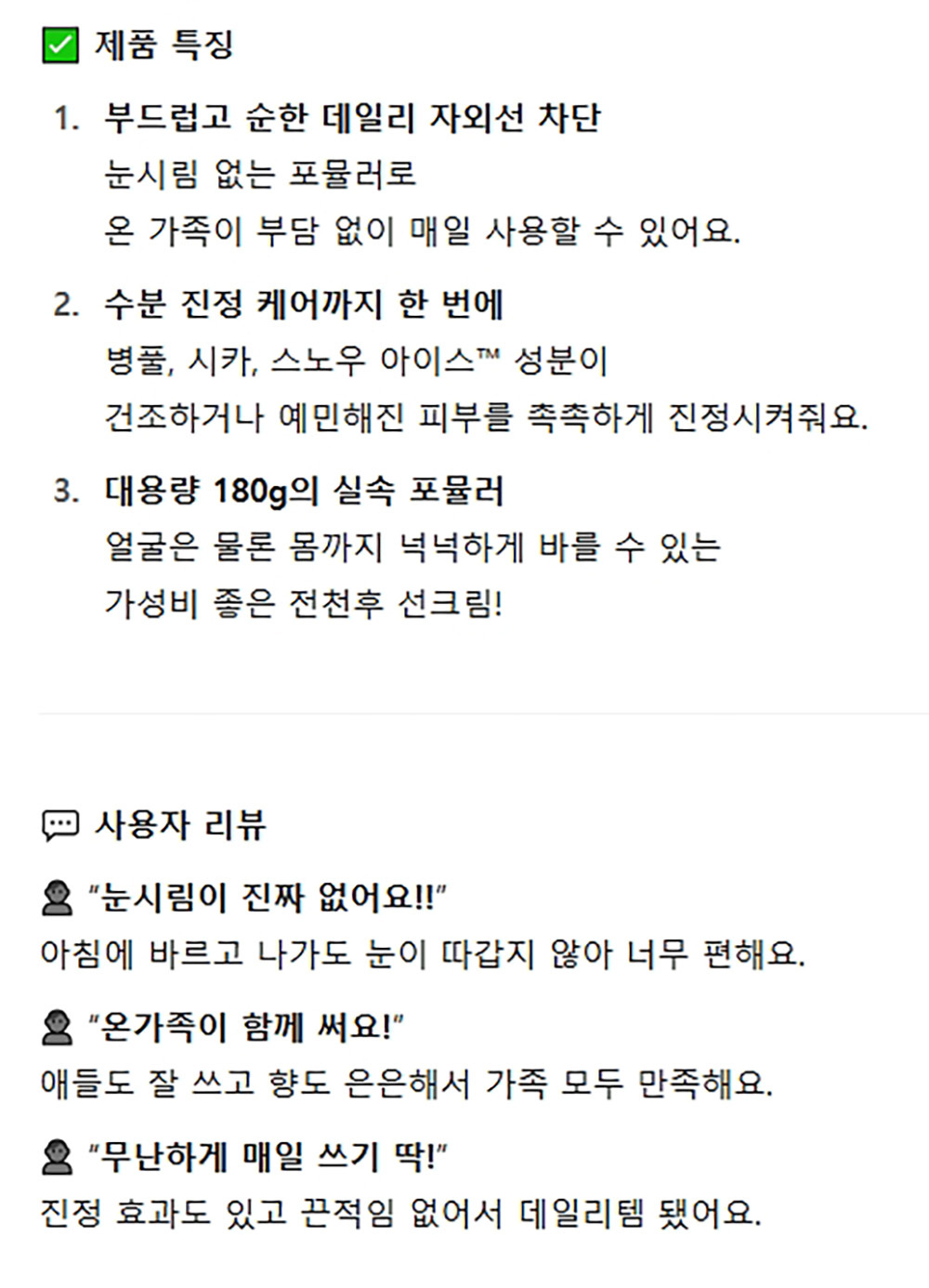 부드럽고 순한 데일리 자외선 시카진정 선크림 180g
