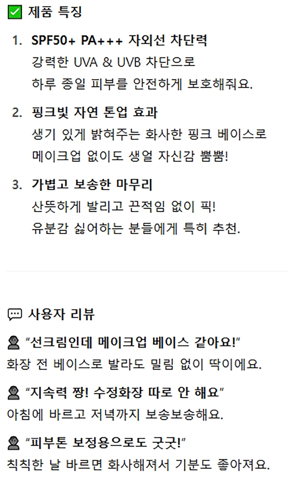 촉촉한 발림성 보송한 마무리 핑크톤업 선크림 40ml