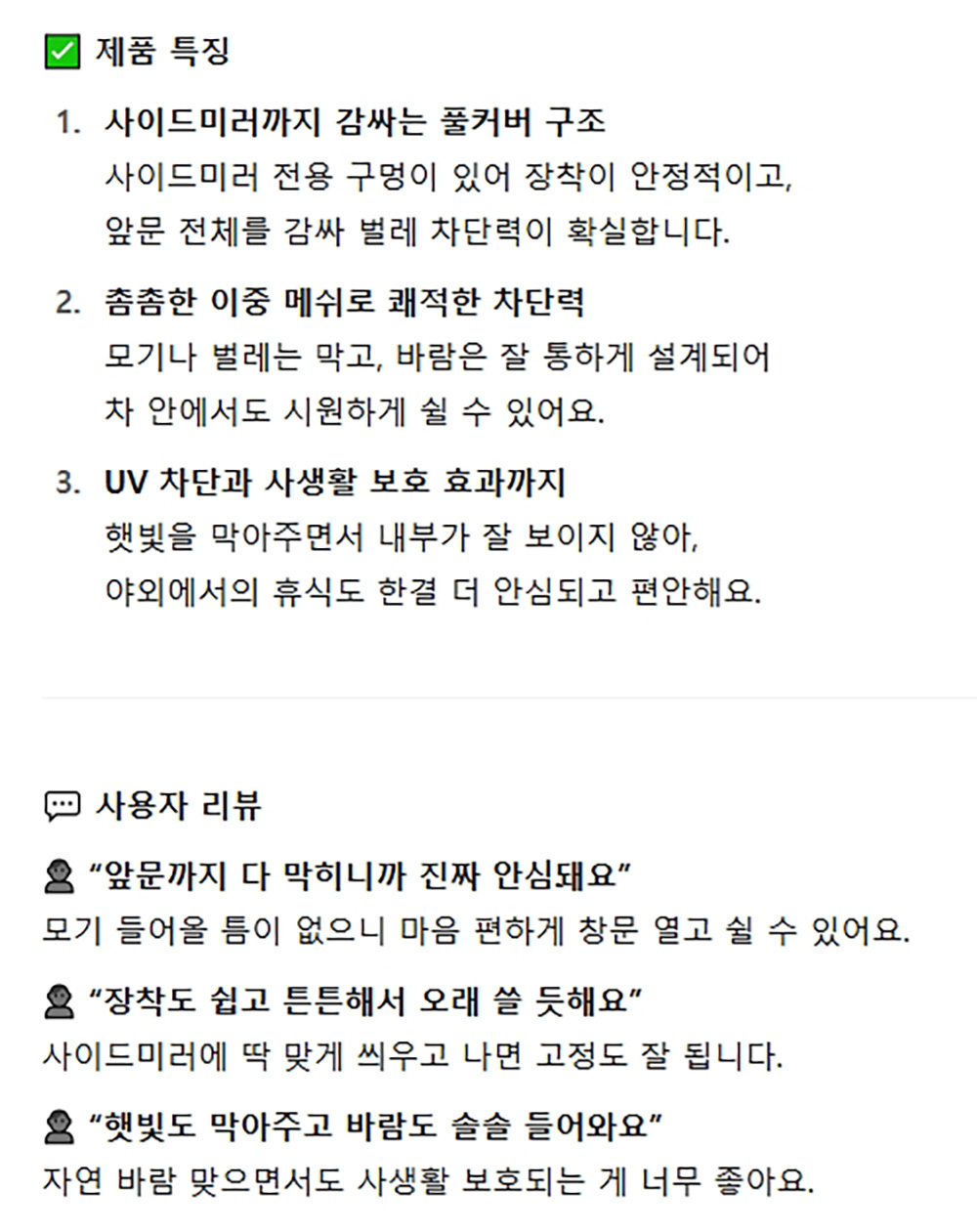 시원한 통풍 사생활보호 UV차단 모기장 자동차 앞창용