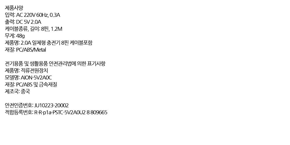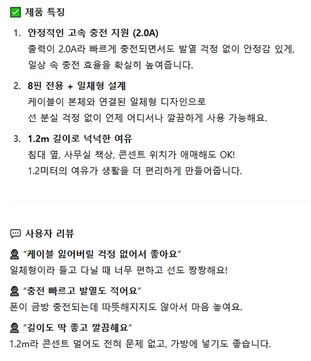 케이블 잃어버릴 걱정 없는 일체형 8핀 충전기 1.2M