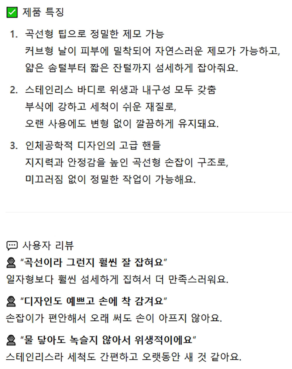 얇은 솜털부터 짧은 잔털까지 제모 커브형 스텐족집게