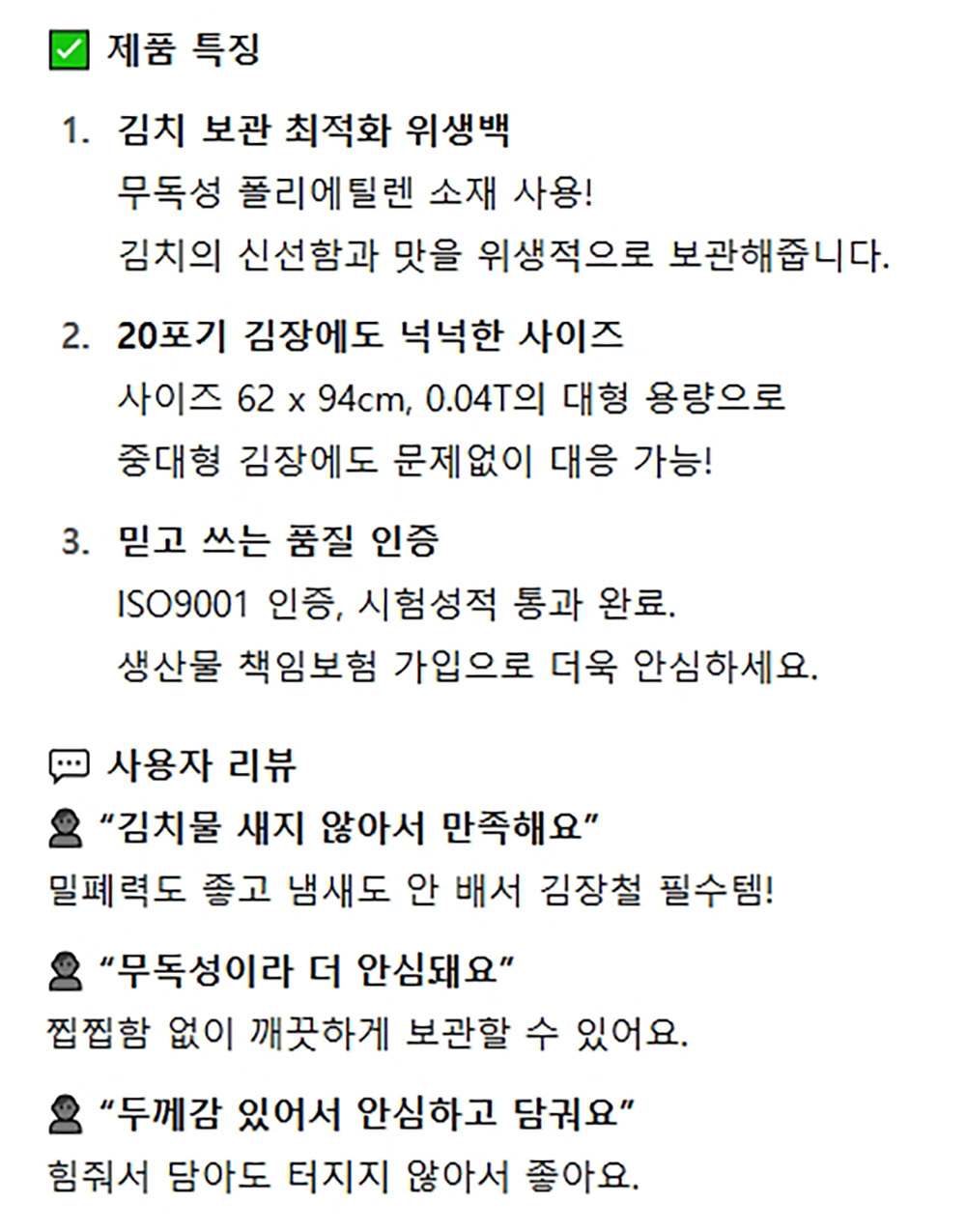 식품 보관 적합한 김장안심봉투 대 2매 20포기용 10봉