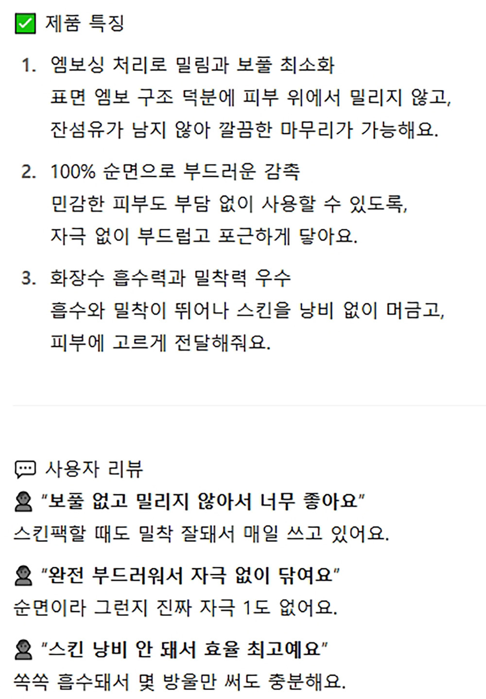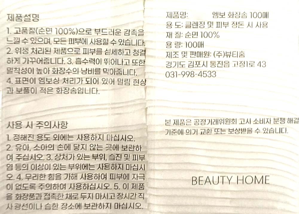 표면 엠보싱 밀림과 보풀이 적은 순면 화장솜 100매