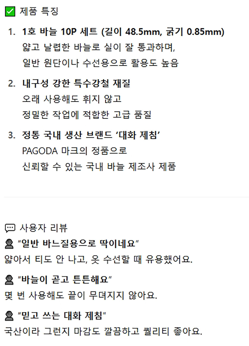 얇고 날렵해서 실이 잘 통과하는 수선용 바늘 10P 5봉