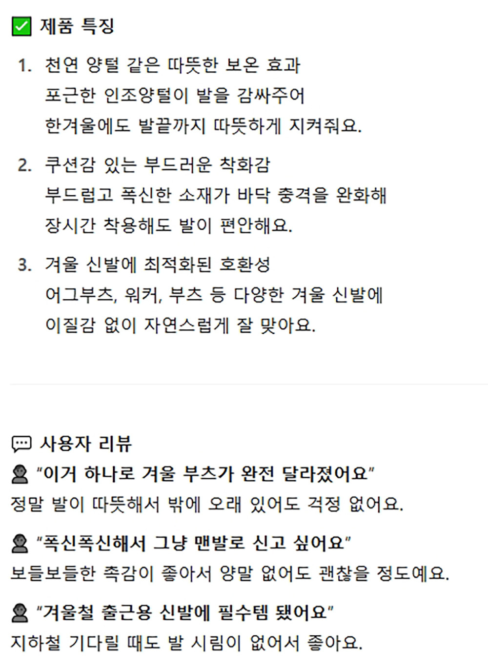 따뜻한 보온기능 부드러운 부츠안 양털 여성깔창 블랙