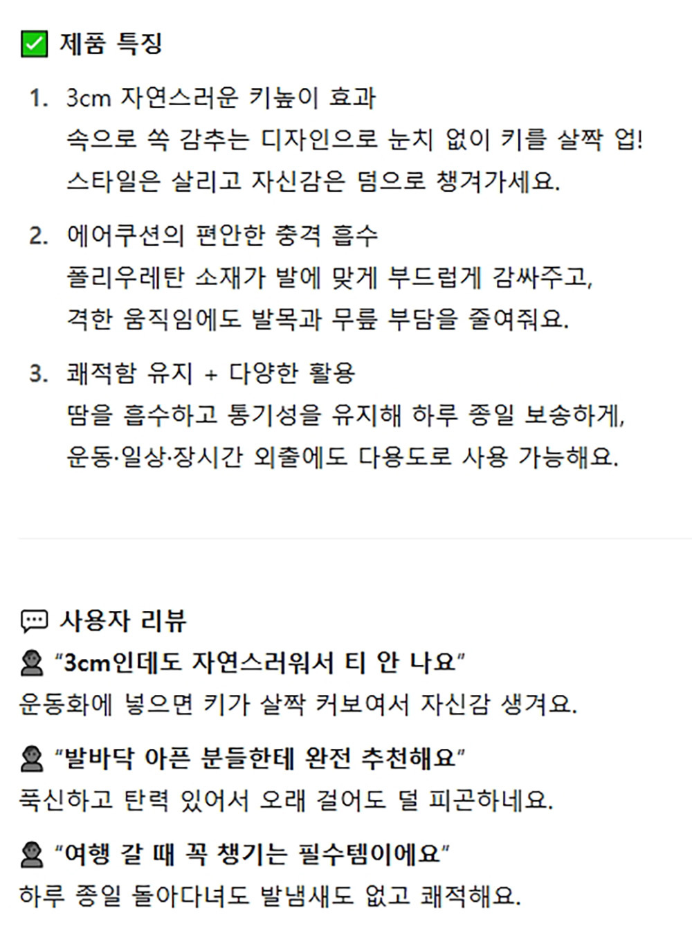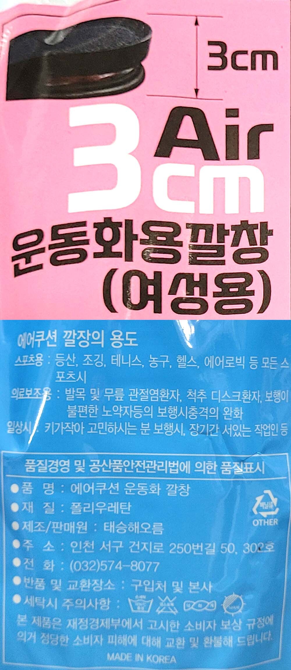 건강한 발 편안한 걸음걸이 키높이 여성용 깔창 3cm
