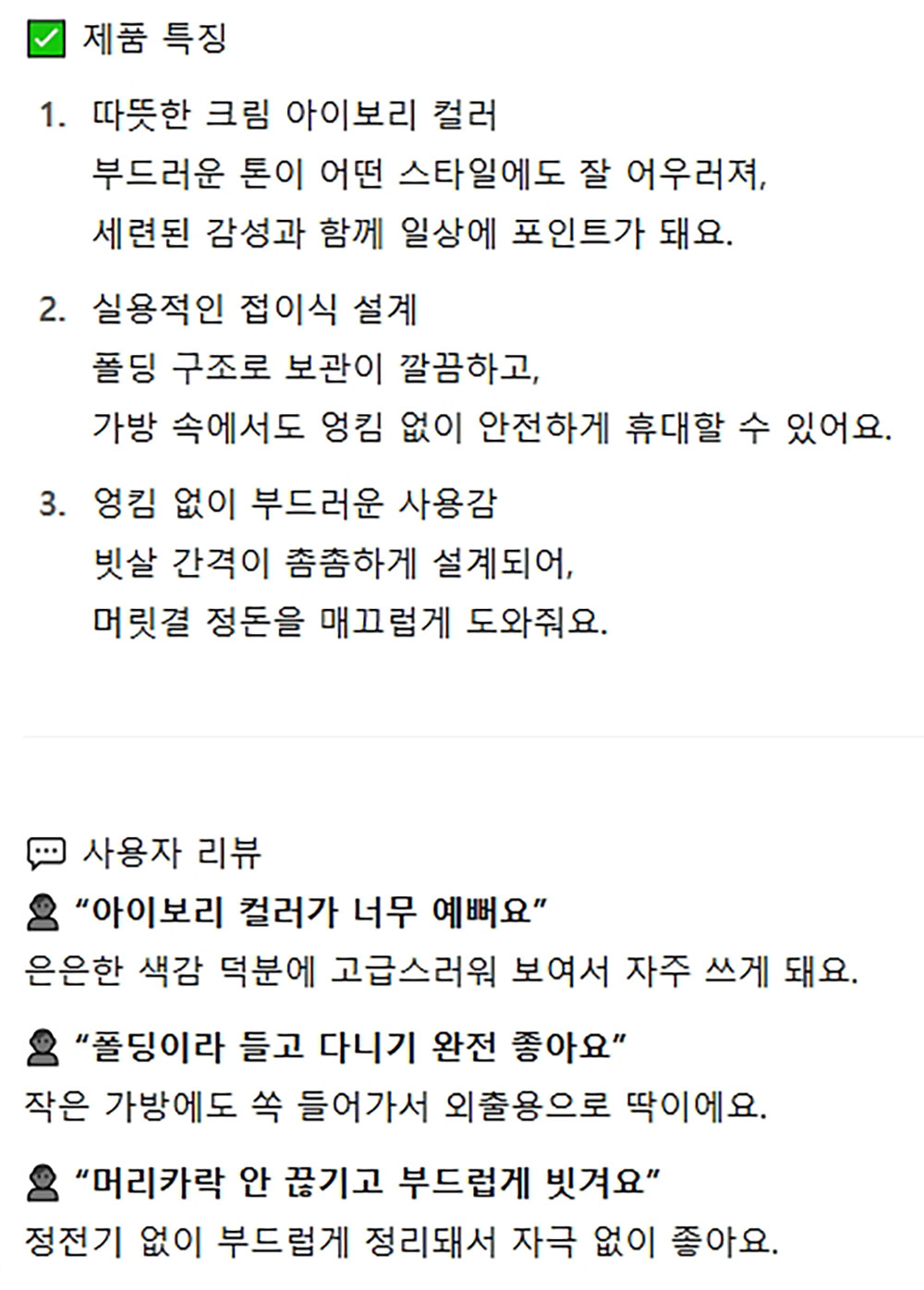 따뜻한 크림 아이보리 컬러 접이식 헤어꼬리빗