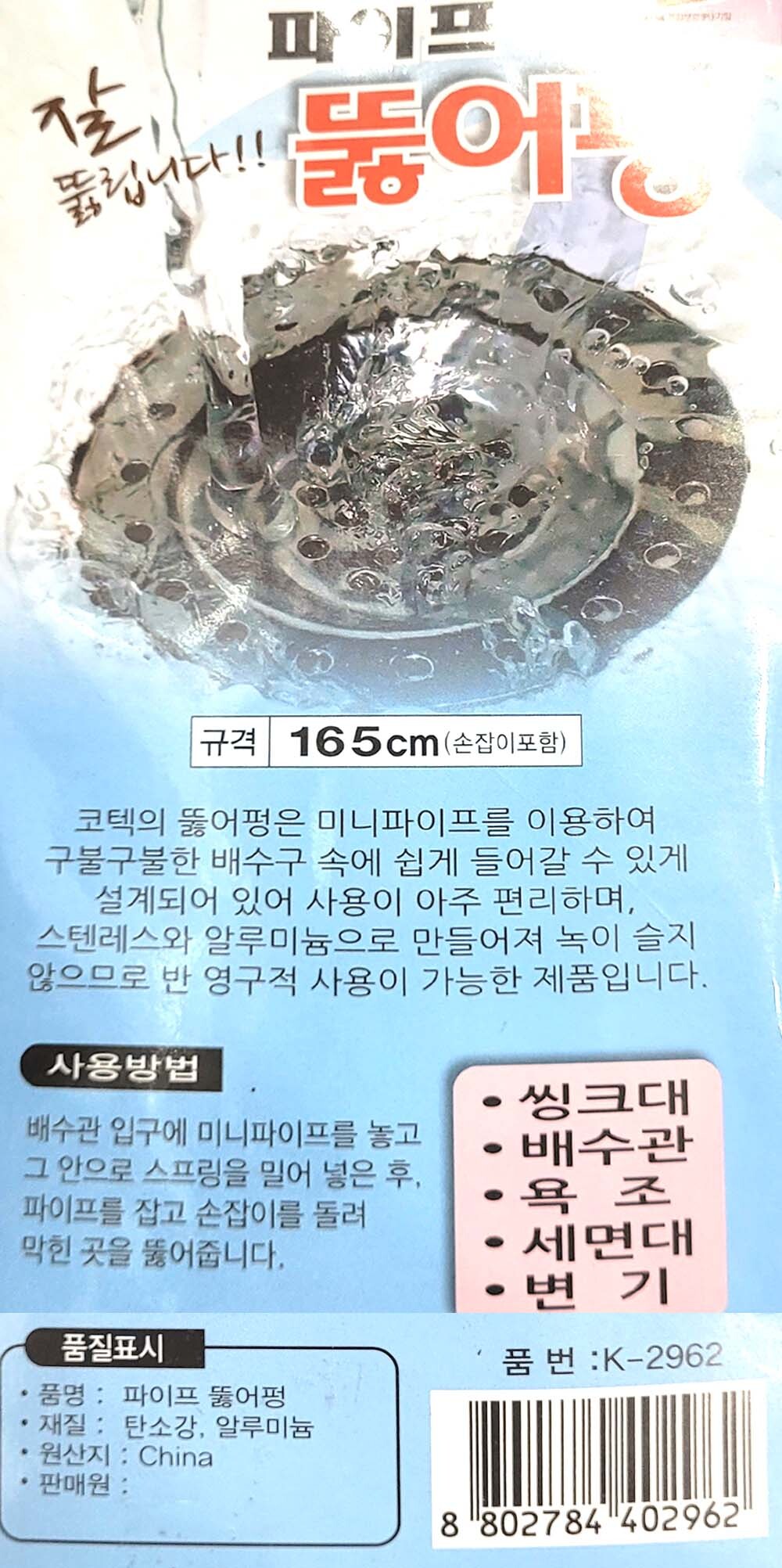 각종 배수관 이물질 막혔을 때 손쉽게 파이프 뚫어펑