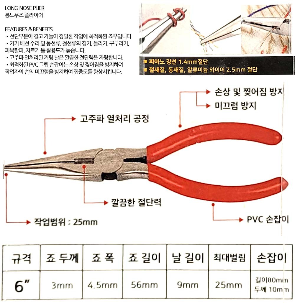 길고 가늘어 정밀작업 공구 롱노우즈 플라이어 162mm