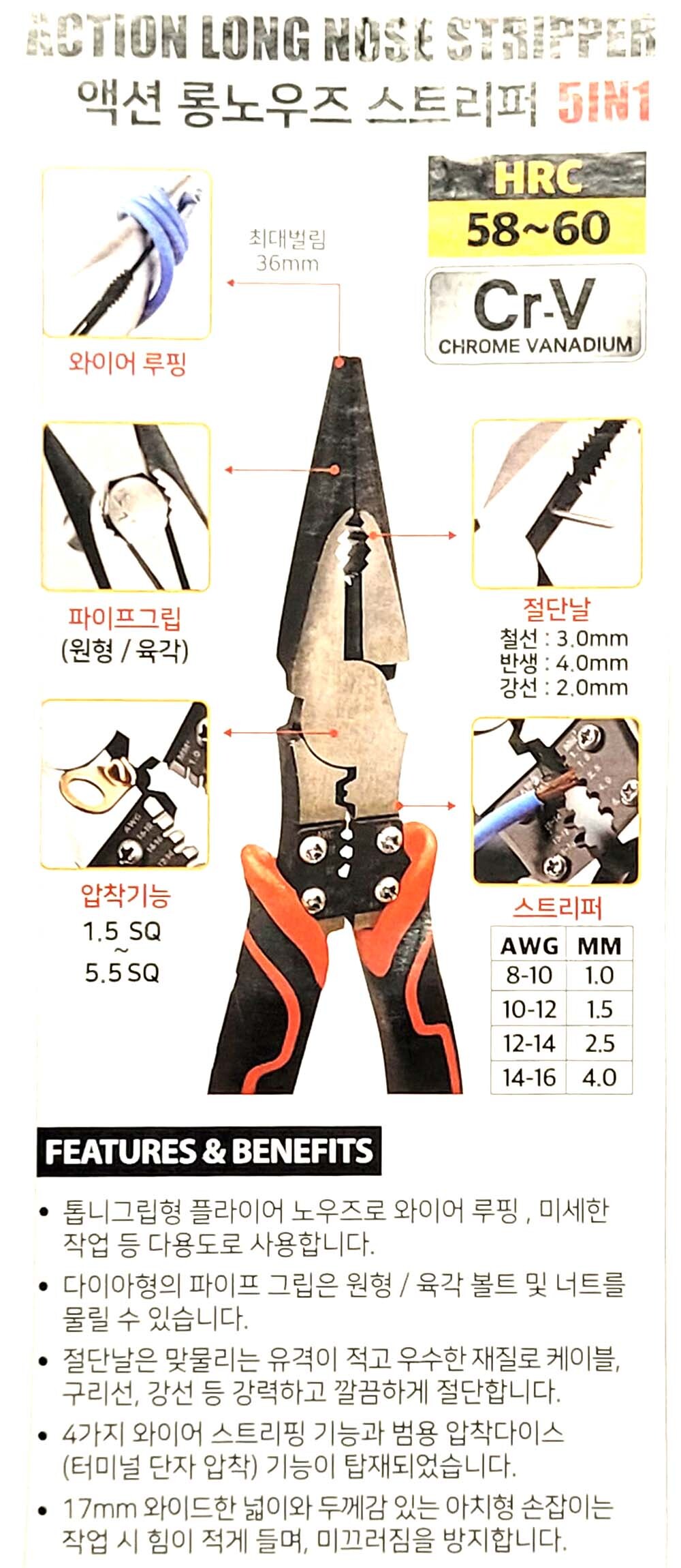 톱니그립형 플라이어 수공구 액션 롱노우즈 스트리퍼