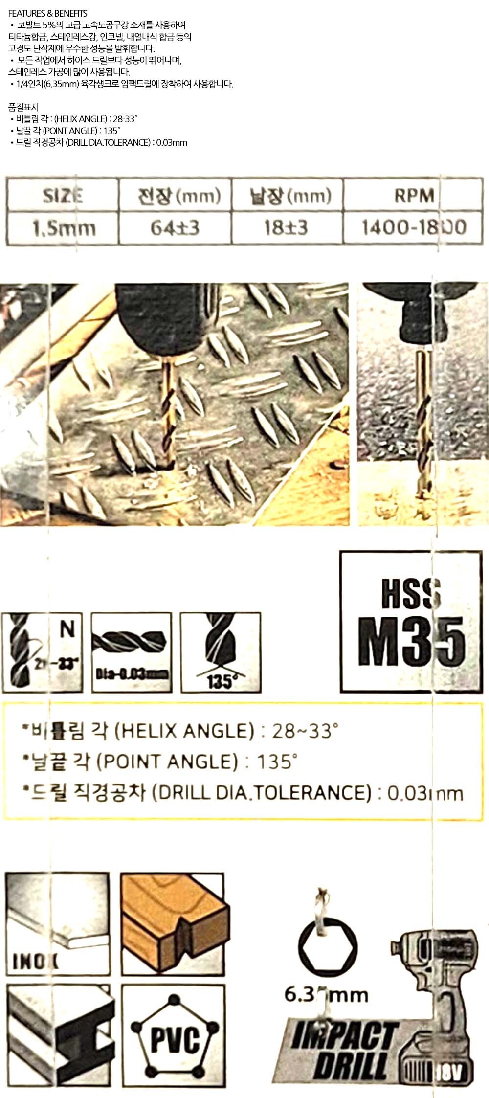 스텐인레스 가공에 많이 사용됩니다 드릴비트 1.5mm