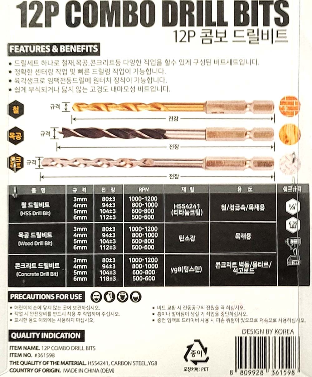 철재 목공 콘크리트 다양한 작업 콤보 드릴비트 12P