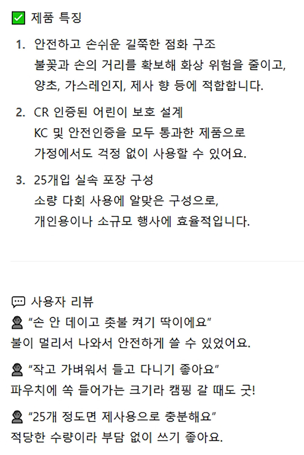 안전하고 손쉬운 길쭉한 점화구조 점화기 25입