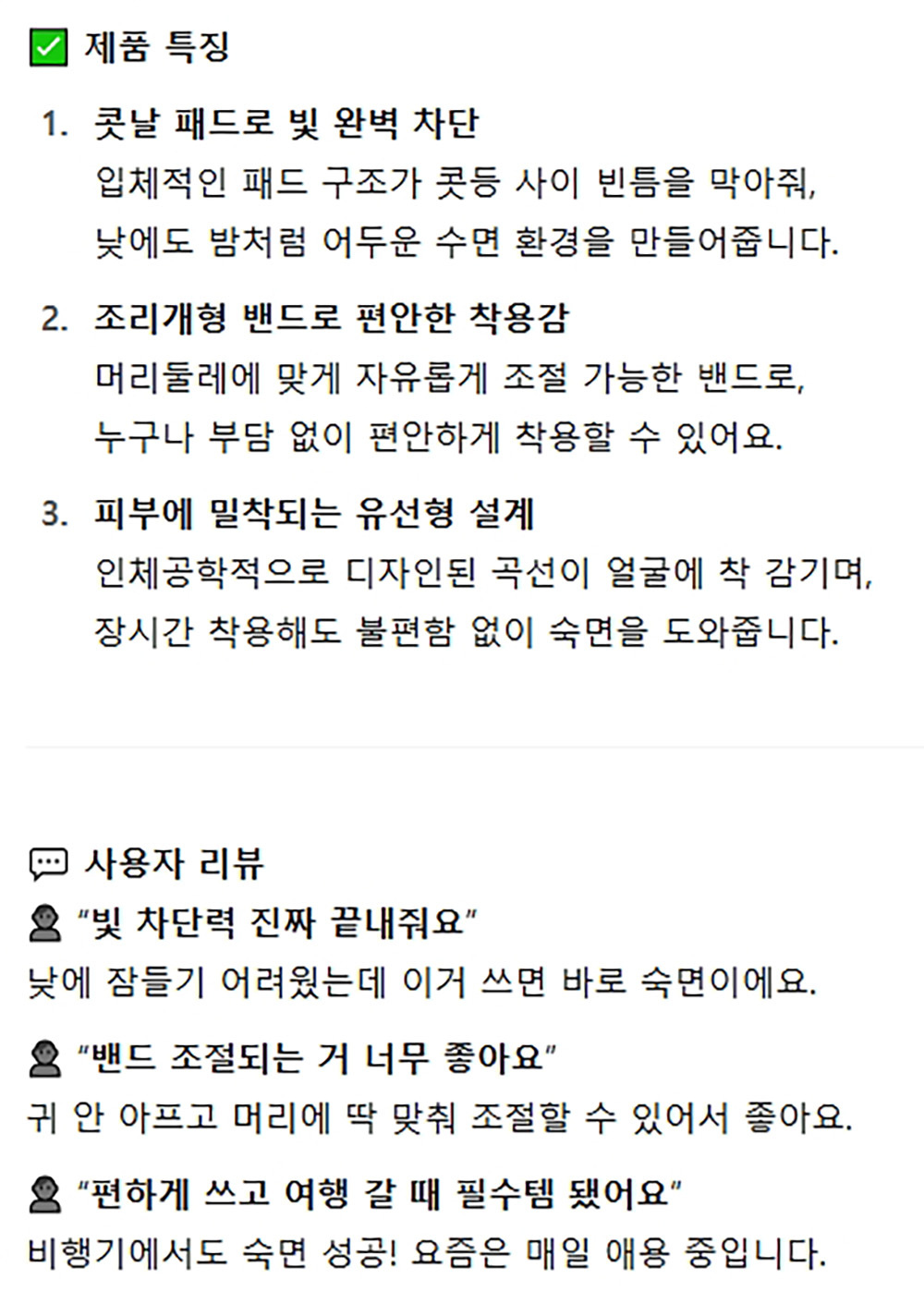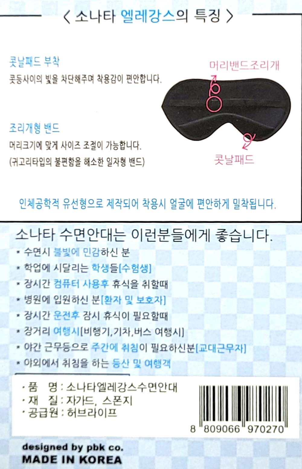 특허받은 순수 국산제품 콧날패드 부착 수면안대