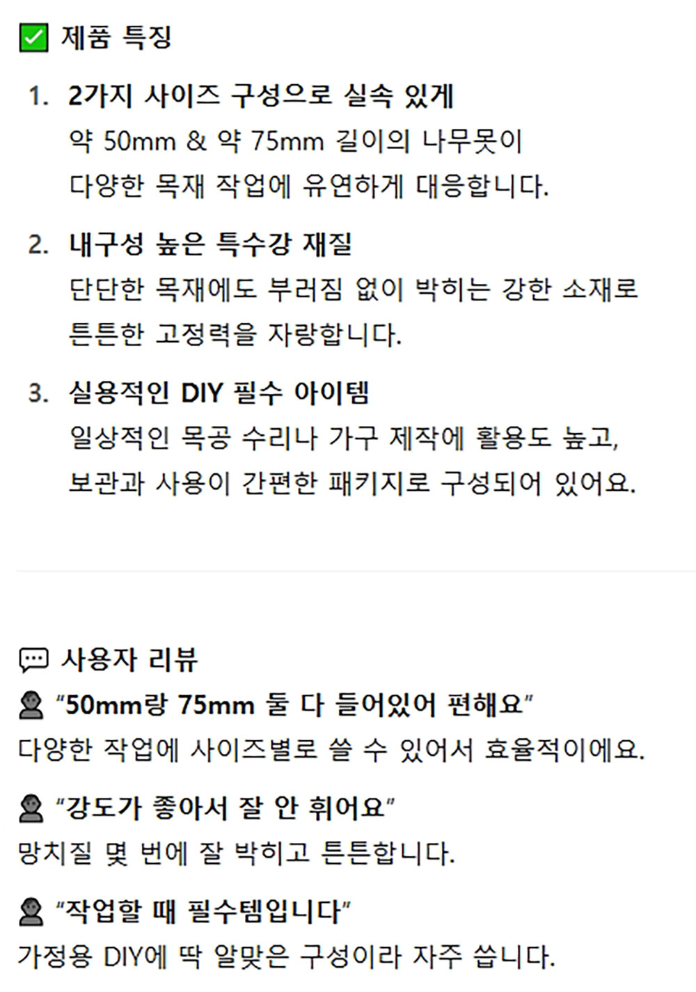 50mm 75mm 2가지 타입 특수강 일반 나무 못세트 대