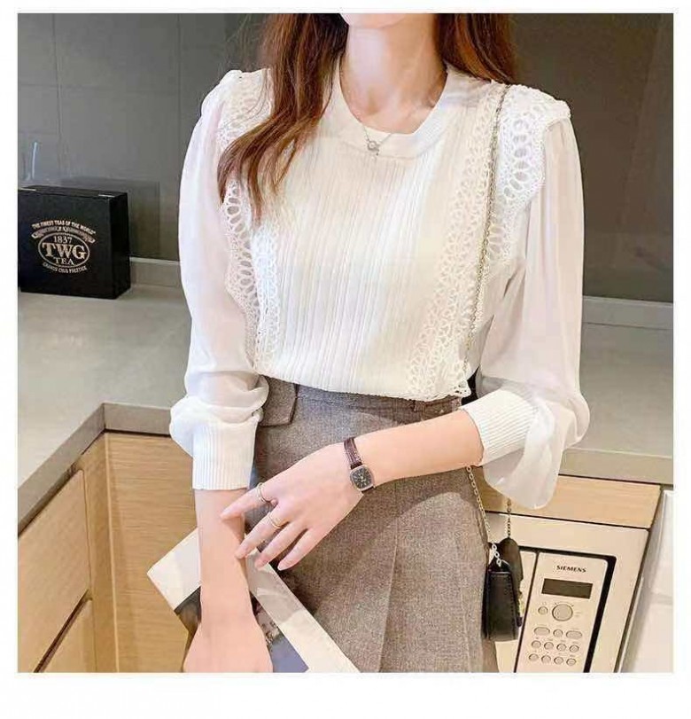 FF95507 2컬러 시폰 소매 라운드 레이스 포인트 라운드 니트 블라우스 티
