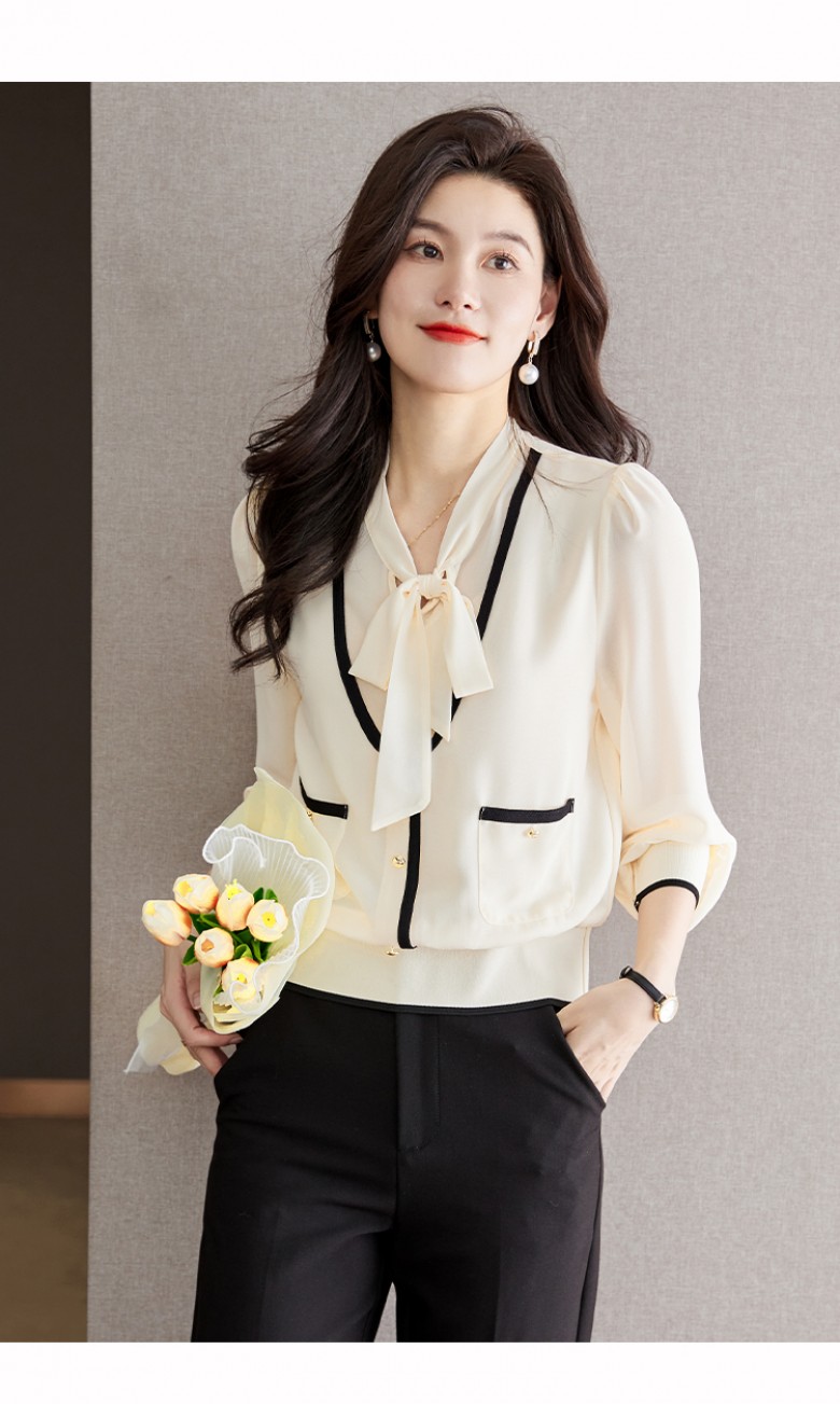 F265831 소매 밑단 시보리 배색 시폰 리본 넥 셔츠 블라우스 데일리 코디탬