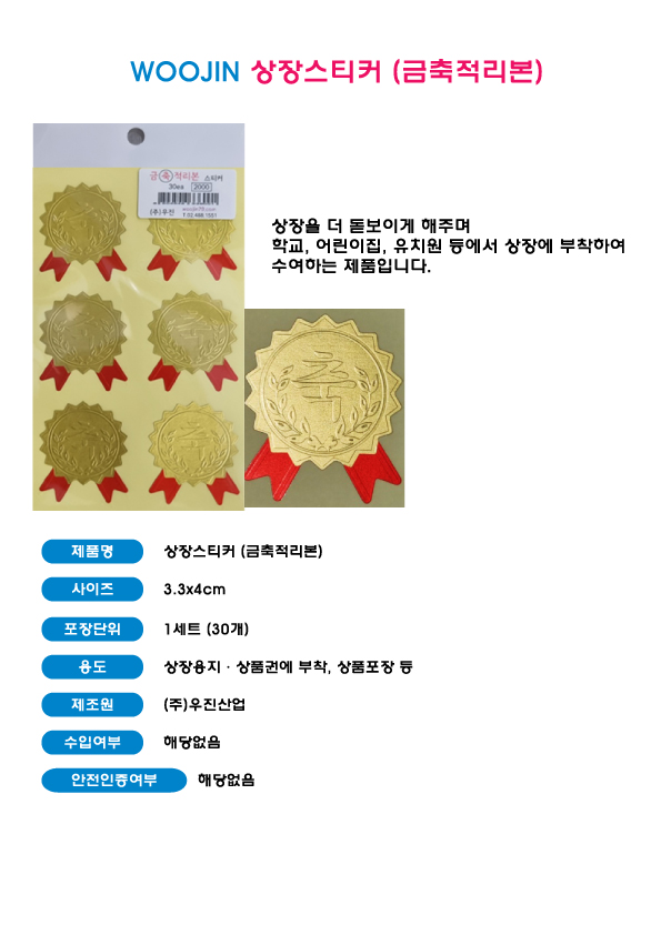 우진 금축적리본 상장 스티커 / 35*40mm