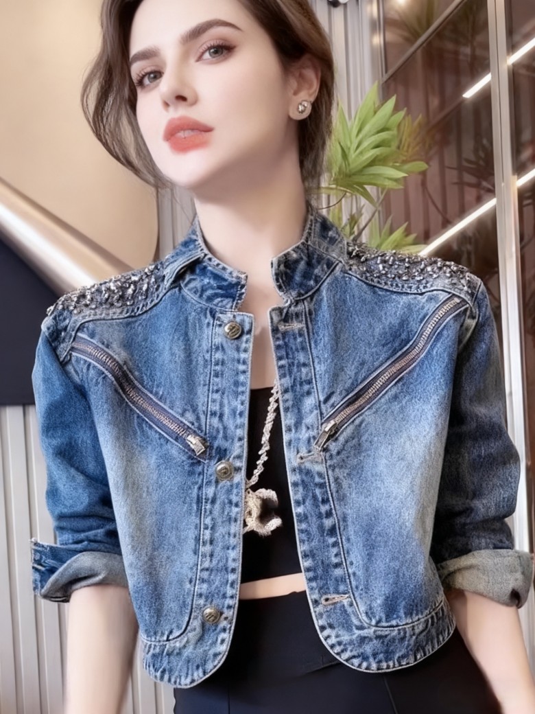 LF30700 찡 비즈장식 라운드 넥 봄 가을 간절기 숏 미니 청 데님 재킷 자켓 아우터 데일리코디