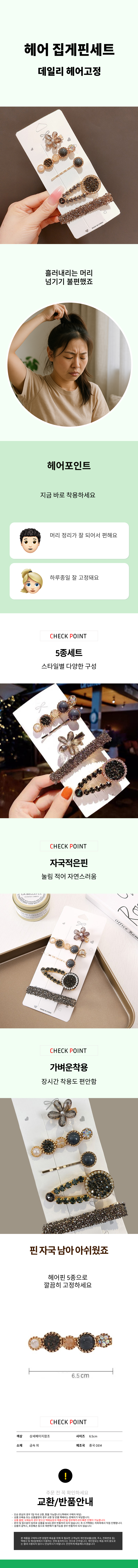 집게삔 여성용 반머리 머리 헤어 헤어핀 머리핀 5종