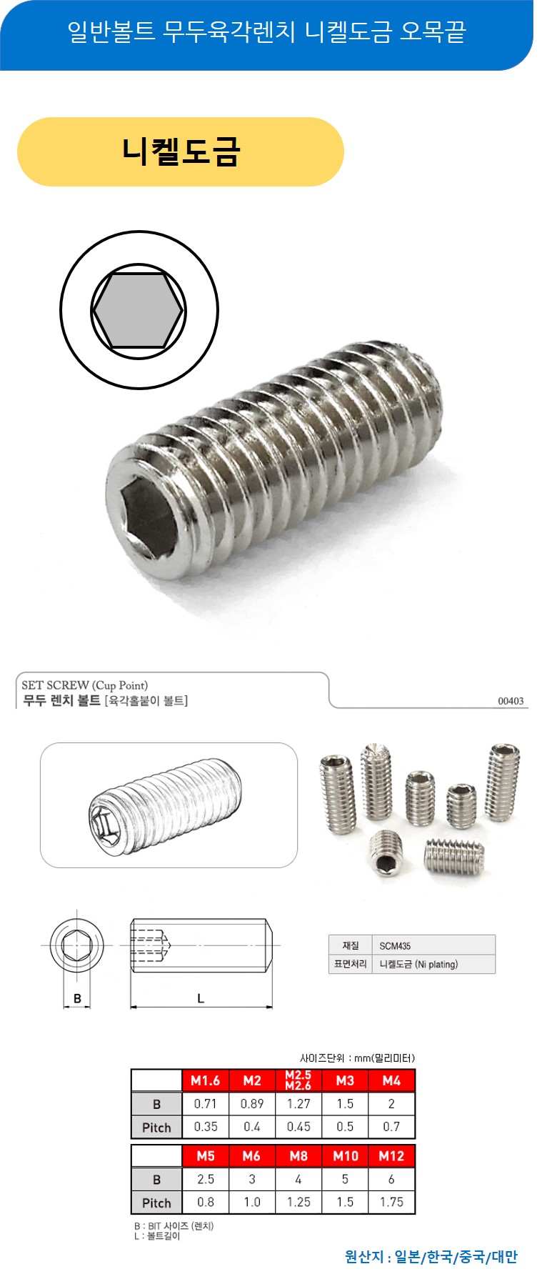 일반볼트 무두육각렌치 니켈도금 오목끝 M4x8mm 1000개