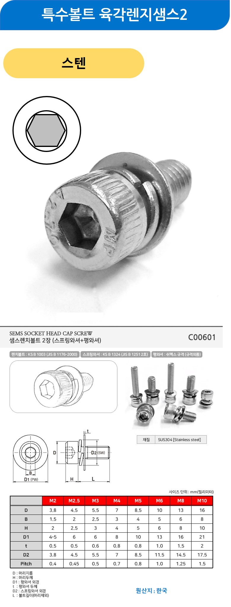 특수볼트 육각렌지샘스2 스텐 M3x8mm 1000개