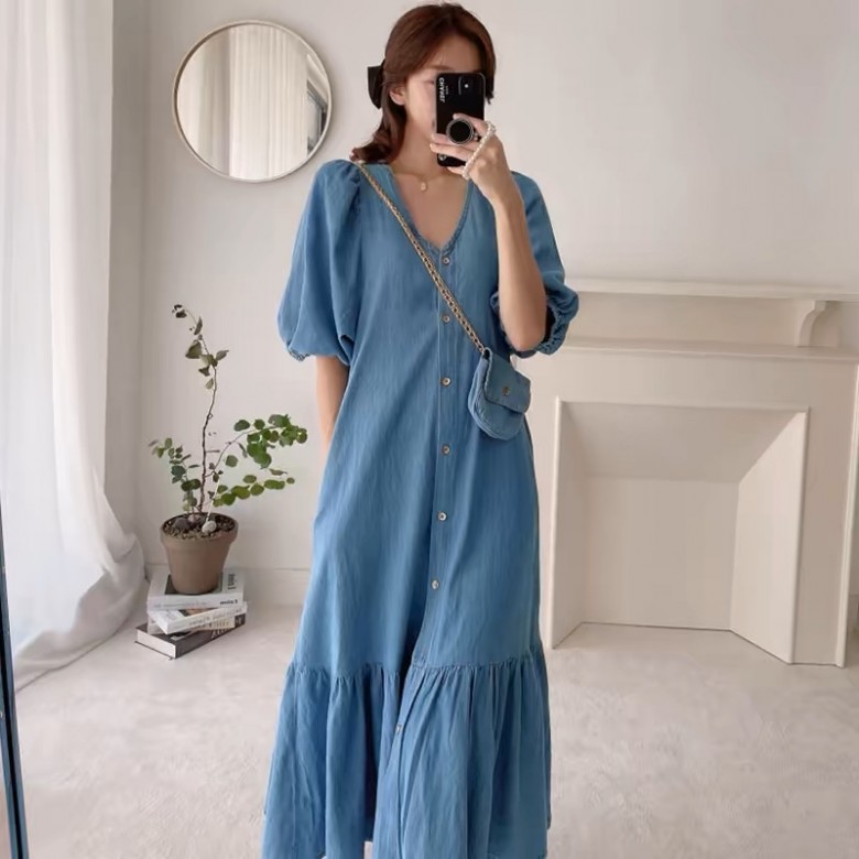 S573701 V넥 앞단추 밑단프릴 해지청 느낌 반팔 롱 원피스 여름 데일리