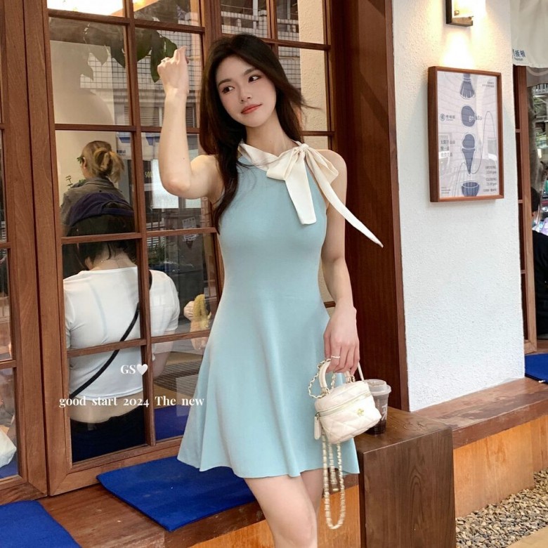 LS13700 2컬러 넥 리본 슬림핏 플레어 민소매 나시 미니 원피스 휴가 데이트룩
