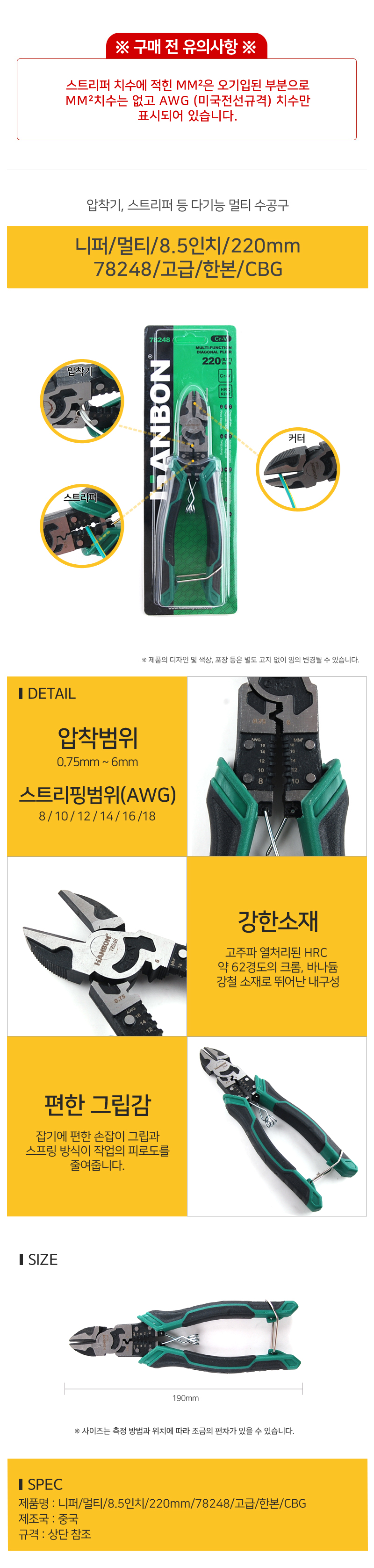 니퍼 멀티 8.5인치 220mm 78248 고급 한본 CBG