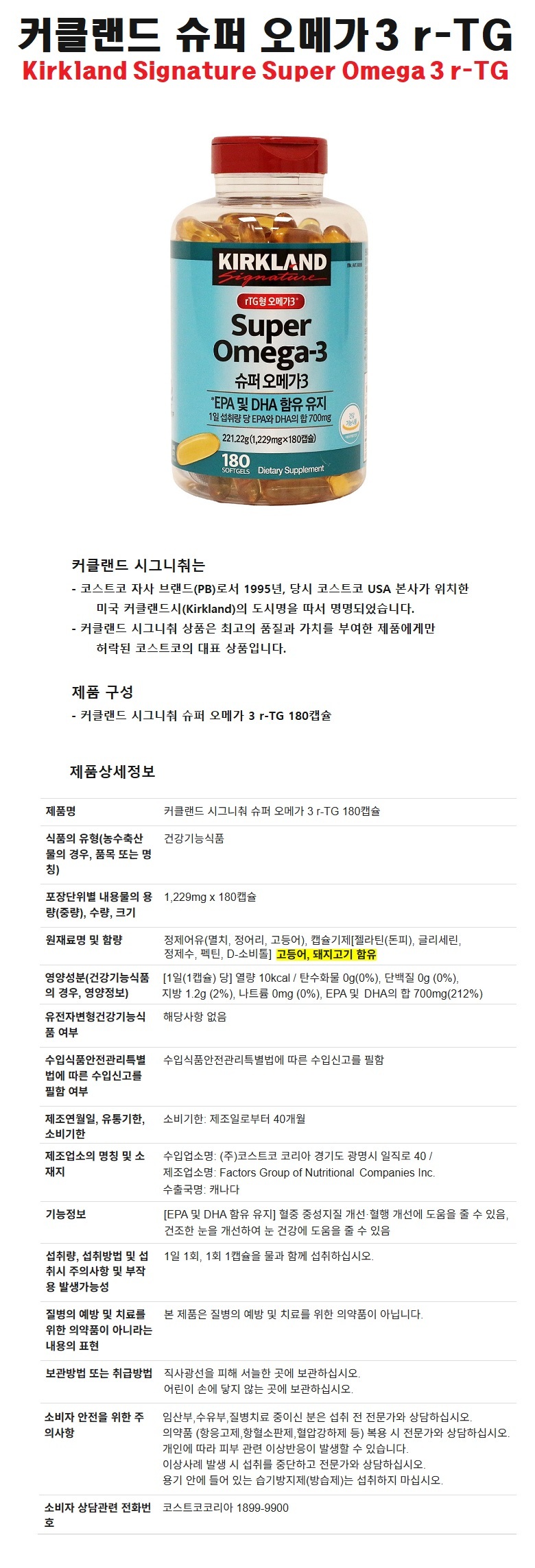 커클랜드 시그니춰 슈퍼 오메가 3 r-TG 180캡슐