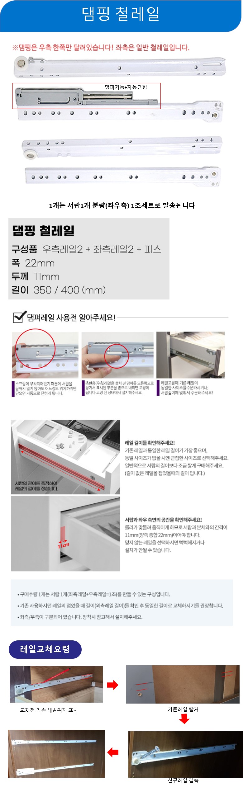 서랍 댐핑철레일 백색 350mm 6개