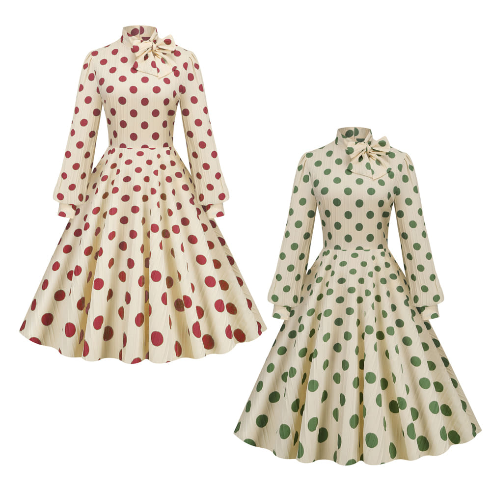(대여) 물방울패턴 레트로 베이지 리본하이넥 원피스.