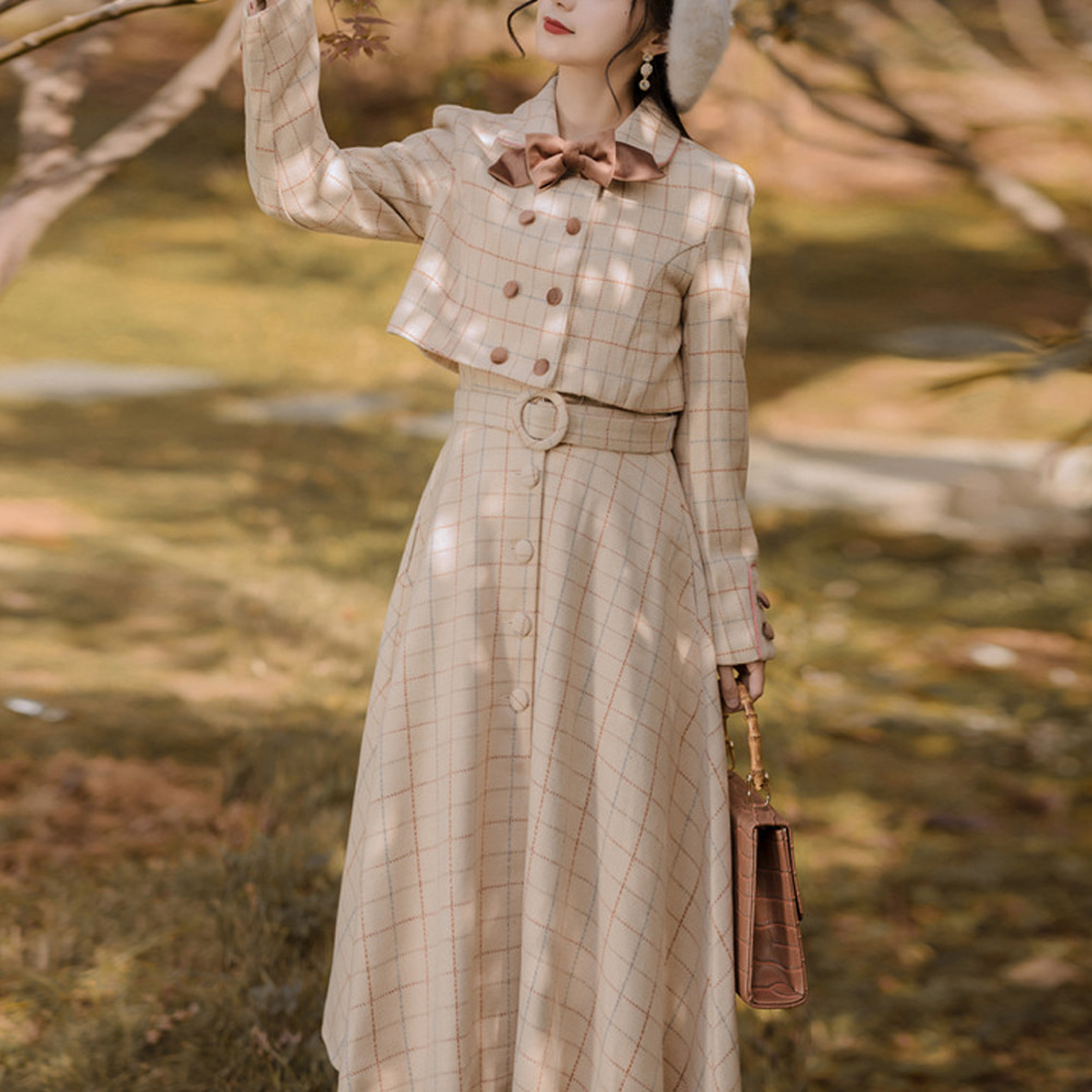 (대여) 베이지체크 어텀 벨트치마 투피스 세트.