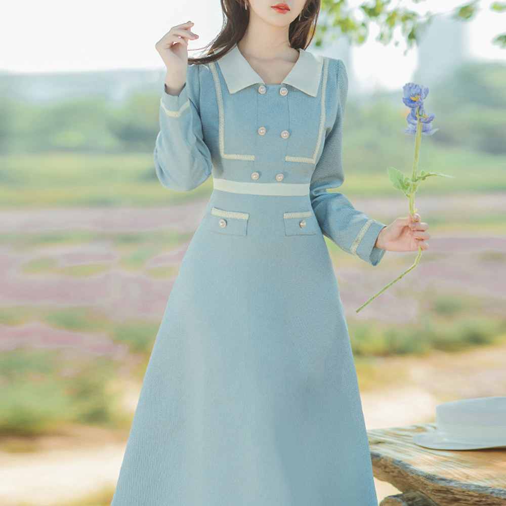 스카이블루 진주버튼 트위드 각카라 원피스 경성의상.
