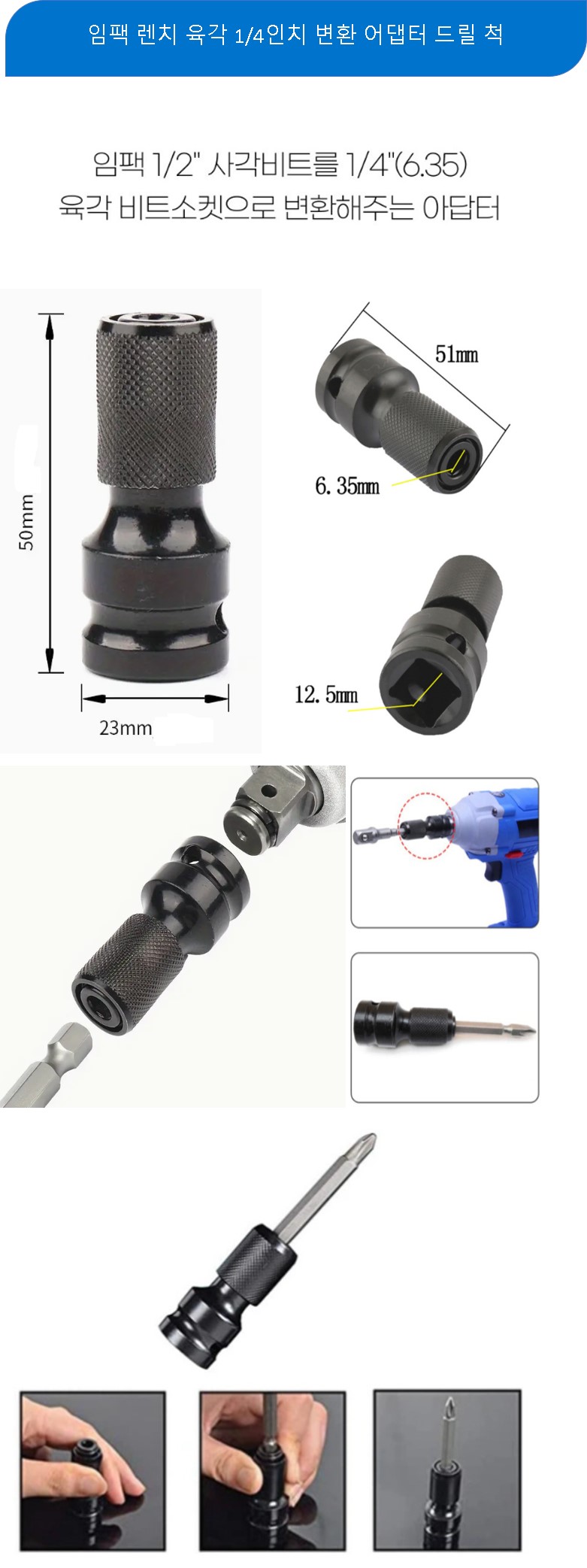 임팩 렌치 육각 1/4인치 변환 어댑터 드릴 척