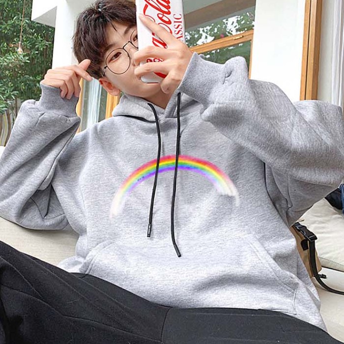 베이직핏 기모 후드티 소매 시보리 무지개 프린팅