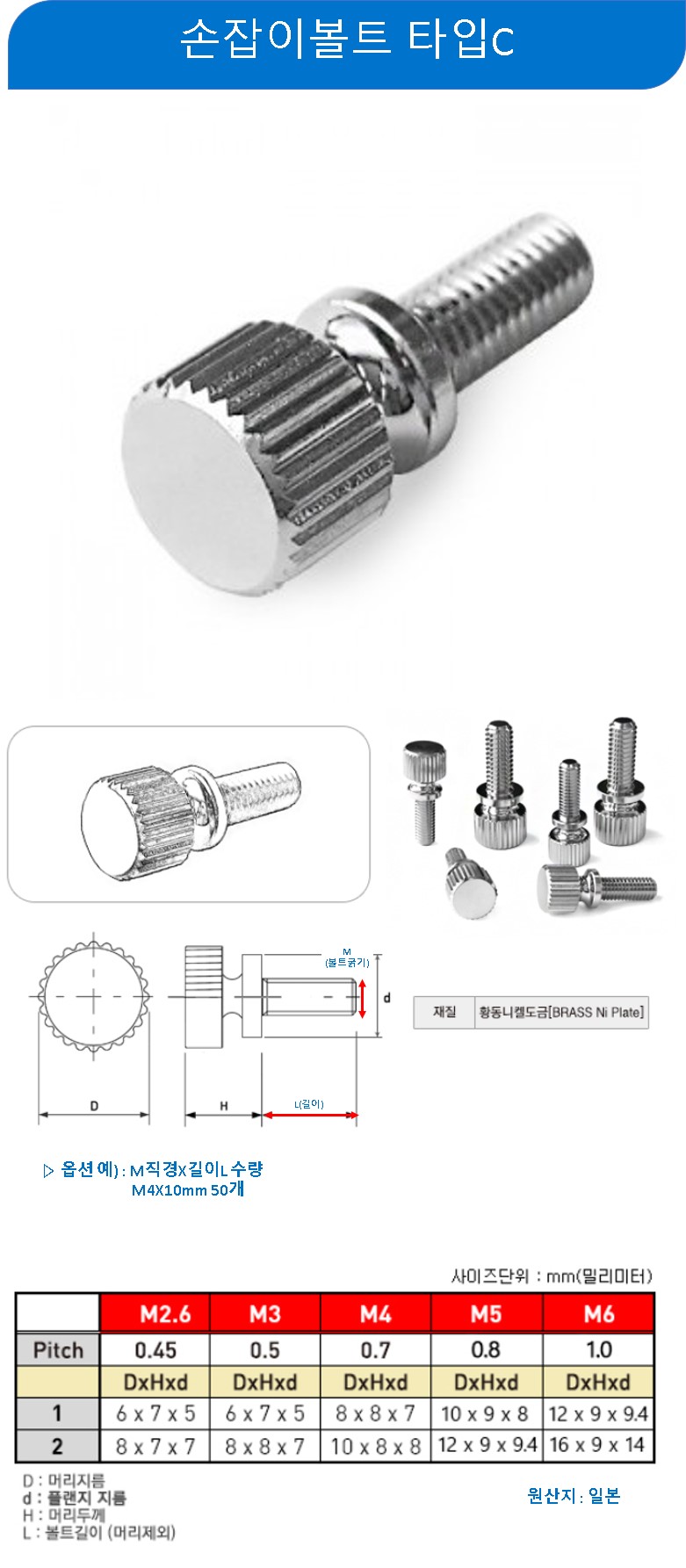 손잡이볼트C형 니켈도금 M2.6(8D7H)x6mm 50개
