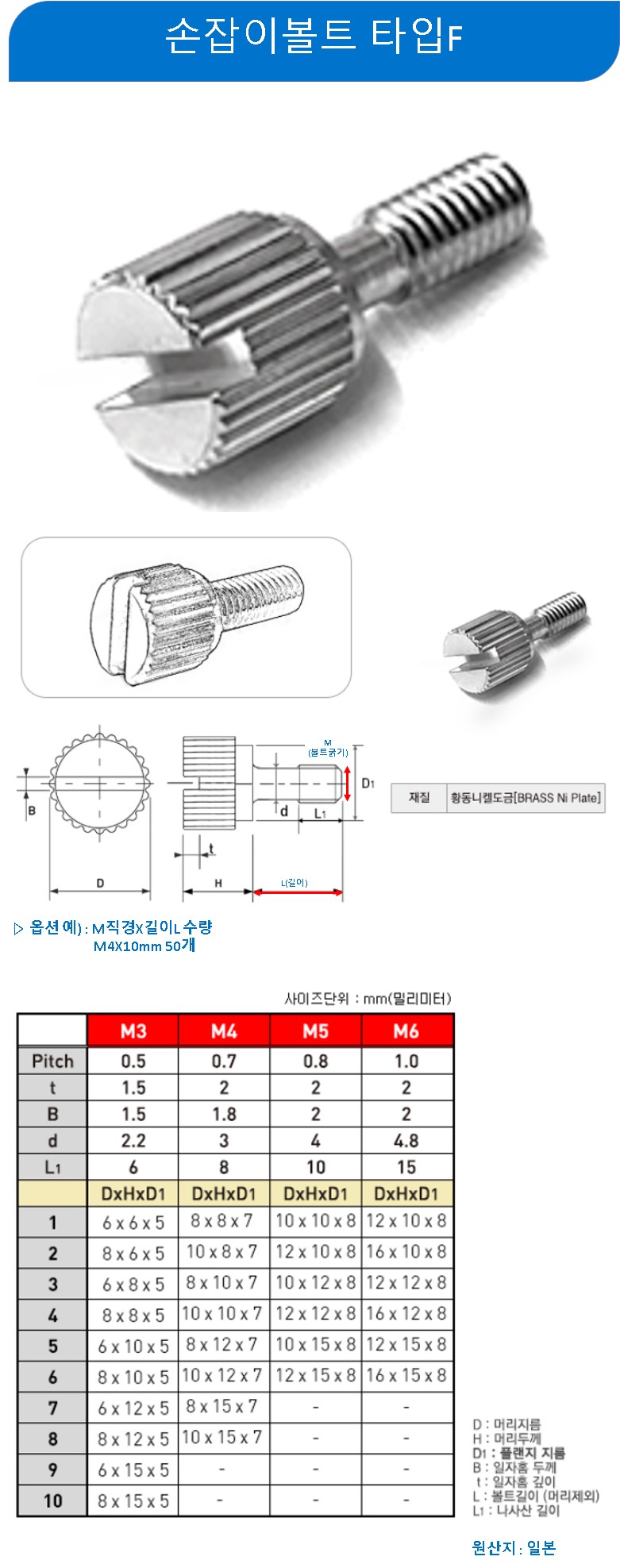 손잡이볼트F형 니켈도금 M3(6D10H)x20mm 40개