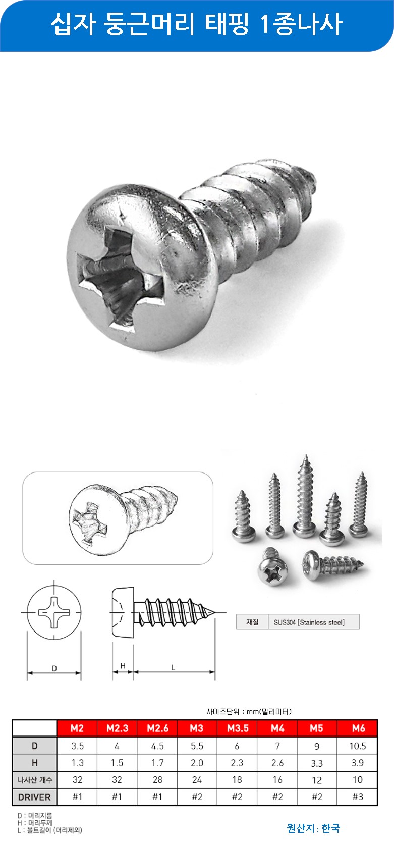 십자 둥근머리 태핑1종 스텐 M4x50mm 600개