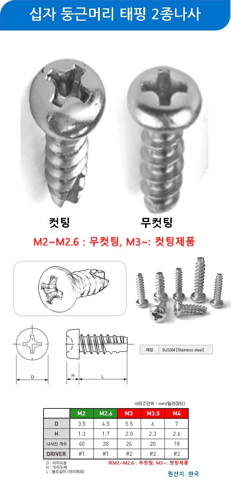 십자 둥근머리 태핑2종 스텐 M2x6mm 4000개