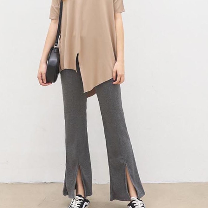 밑단 절개 나팔 팬츠 잔골지 밴딩 바지 슬림핏
