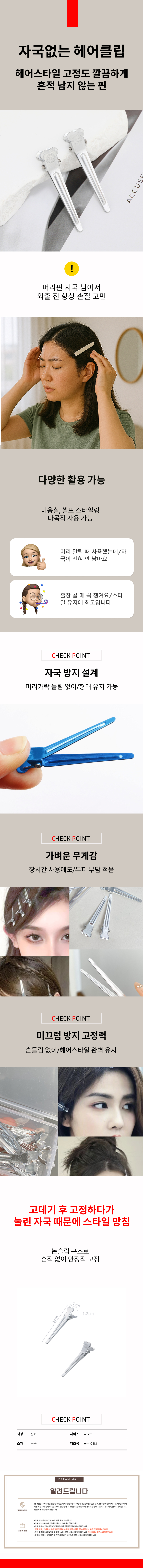 여성용 실버 헤어클립 미용실 헤어집게핀 머리핀