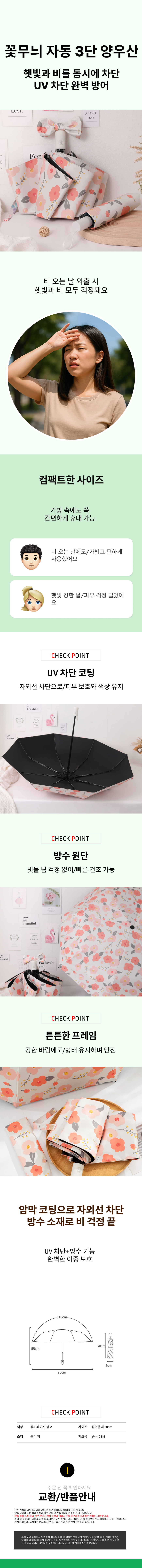 원터치 자동 꽃무늬 암막양산 자동 3단 uv차단 우양산