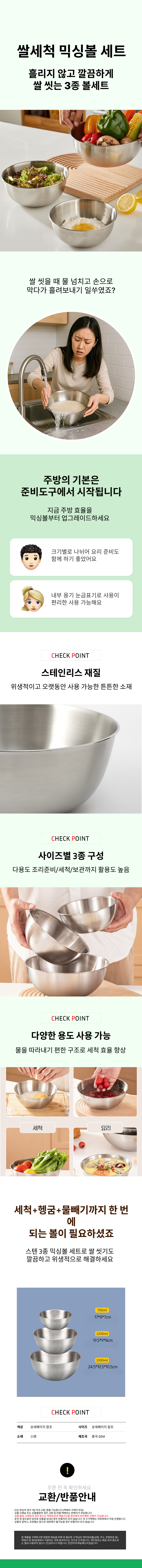 다용도 스텐 믹싱볼 쌀세척 볼 사이즈별 3종세트
